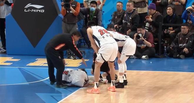 4分07秒,场上发生意外,北京反击回合,萨姆纳推倒周琦,徐杰在乱战中被倒地的周琦一把撞倒,徐杰膝盖遭到重创!伤情十分严重。