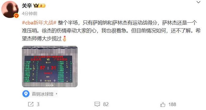 上半场广东打的极差,几乎全员梦游,胡明轩萨林杰王少杰合计16中1,全队就靠一个萨姆纳在得分,萨姆纳一人包揽广东半场31分里的23分,但他这一场也是战犯,第二节要不是他手贱推倒了周琦,徐杰也不会重伤。