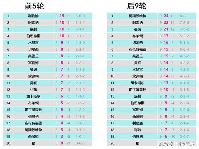 不妨先看看这个积分榜,一个是英超前5轮的,一个是英超后9轮的(曼联和西汉姆未赛),大家能不能发现一些有趣的事情呢?